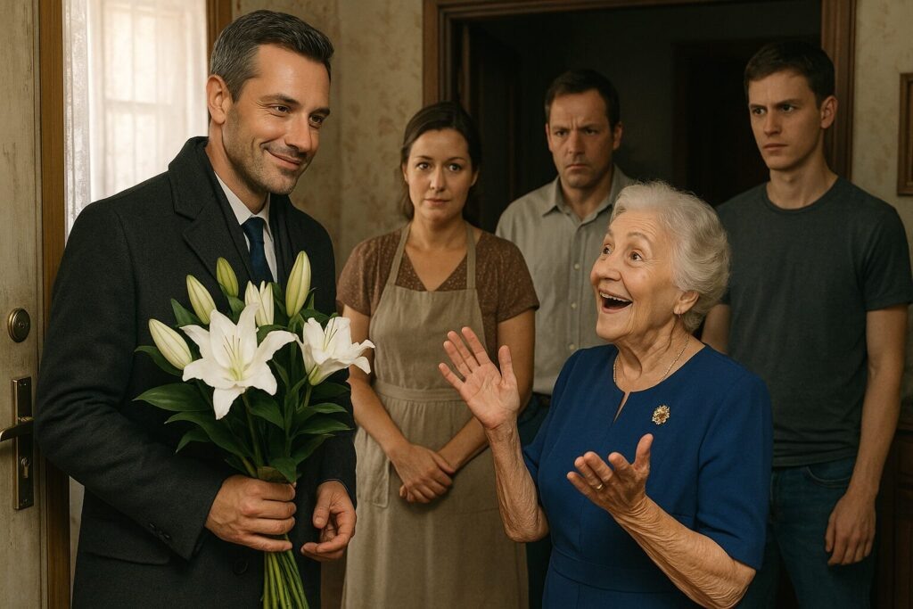 На пороге стоял Роман — улыбающийся, с букетом лилий и пакетом, в котором угадывалась бутылка виски.