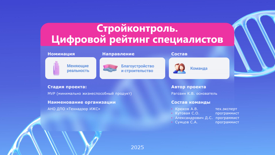 Важно отметить, что проект «Строительный контроль. Цифровой рейтинг» не возникает на пустом месте. Его разработка ведется в тесном сотрудничестве с корпорацией ТЕХНОНИКОЛЬ, на базе существующей и авторитетной платформы ROOF.RU. Это партнерство обеспечивает проекту мощную поддержку, доступ к широкой аудитории и возможность интеграции в уже сложившуюся экосистему строительного рынка. Более того, три высококвалифицированных специалиста корпорации вовлечены в процесс разработки, обеспечивая высокий уровень экспертизы и практической применимости создаваемого решения.