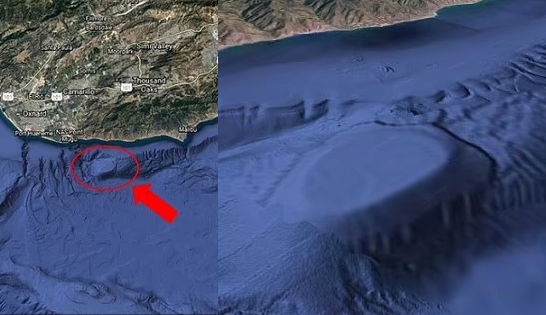 Это необычное образование было замечено глубоко в океане в нескольких милях от побережья на снимках Google Earth 2014 года. Объект, прозванный Сикомор-Ноллом, находится на глубине около 600 метров под водой, его ширина – 4-5 км. Исследователи предположили, что это подводная база инопланетян.