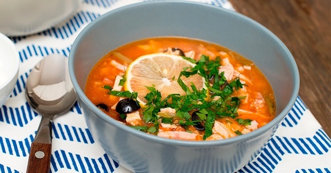 Приветствую вас, дорогие читатели! Сегодня у нас с вами в меню солянка с капустой. Будем готовить вкусное сытное и наваристое кушанье. Содержание Если мы заглянем в толковый словарь В. И. Даля, то увидим следующее определение солянки: “горячая похлебка с мясом, капустой, луком и огурцом”. С одной стороны, она напоминает русские щи, а с другой – рассольник. Подают ее на первое. Говяжья голень 300 г. Копченая говядина 100 г. Карбонад 100 г. Сосиски 70 г. Капуста 300 г. Картофель 2 шт. Соленые огурцы 3 шт. Красный лук 1 шт. Сельдерей 1 шт. Маслины 0.5 банки. Томатная паста 3 ст. л. Вода 3 л. Укроп 1 пучок. Петрушка 1 пучок. Соль по вкусу. Перец черный молотый по вкусу. Паприка копченая 1 ч. л. Молотый тимьян 1 ч. л. Лимон 1 шт. Масло растительное 2 ст. л. На 100 грамм: Калории: 37,73 ккал Белки: 2,45 г. Жиры: 2,17 г. Углеводы: 1,87 г. Шаг 1 из 19 В глубокой кастрюле разогреваем 2 столовых ложки растительного масла. Шаг 2 из 19 На разделочной д