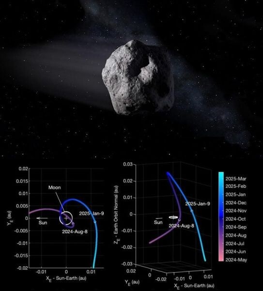 (Результаты: Вселенная. «ХиЖ» 2025 №4) Большинство из многих сотен околоземных астероидов происходит из пояса астероидов между орбитами Марса и Юпитера, но небольшое число близких к Земле тел могло прилететь с Луны. Первое из них ученые обнаружили в 2016 году. Это астероид (469219) Камоалева диаметром до сотни метров. Угрозы он не представляет. Выбить его из Луны мог удар неизвестного небесного тела. В прошлом году внимание астрофизиков привлек околоземный астероид 2024 PT5 поперечником в десяток метров. Его в 2024 году увидел южноафриканский телескоп ATLAS-Сазерленд, участвующий в программе НАСА по оповещению о столкновениях с астероидами. Движение тела вокруг Солнца повторяло земное и подтверждало, что новый объект возник неподалеку от нашей планеты. Изучить астероид решила группа астрономов во главе с Теодором Каретой (Theodore Kareta) из Обсерватории Лоуэлл в Аризоне. С помощью ее телескопа, а также инфракрасного телескопа НАСА гавайской Обсерватории Мауна-Кеа ученые тщательно иссл