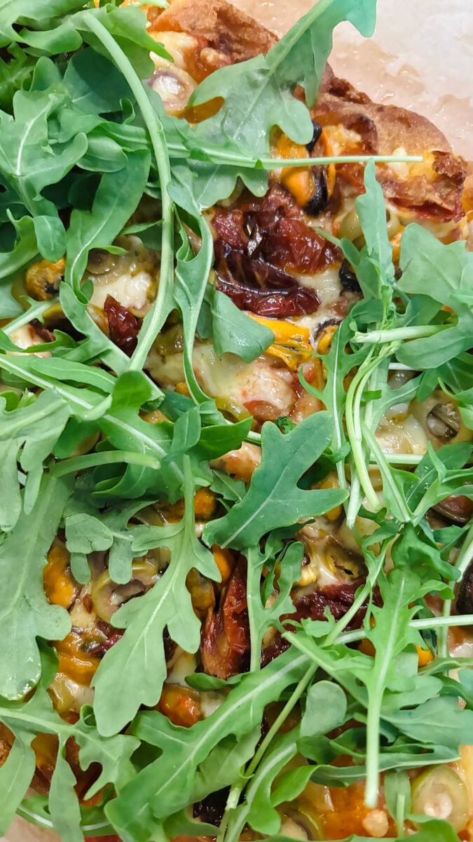сегодняшняя - это посыпала основу тертым сыром, на пять минут в разогретую до 250 духовку, потом добавила мидии, ещё на пять минут. потом нарезанные оливки и вяленые томаты, пара минут в духовке, вытащить, нарезать на 6 частей, посыпать рукколой, есть кайфуя.