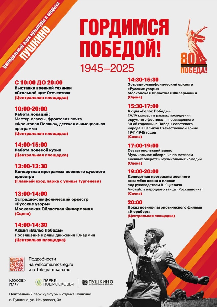 💥В округе Пушкинский в рамках празднования Дня Победы проведут концерты во дворах для ветеранов, в парках и на центральных площадках пройдут выступления творческих коллективов и духовых оркестров, смотры военной техники, а для детей подготовили анимацию и мастер-классы. На реке Серебрянке в Пушкино впервые пройдет парад на воде «Победная флотилия». @pushkinomedia