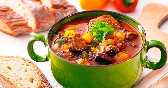 Но такие густые супы на говядине любят готовить не только в Венгрии. Густой вкусный суп от которого сложно отказаться, готовят повсеместно. Обжаренные кубиками кусочки говядины в томате с базиликом, тмином, мускатным орехом и острым красным перцем придают блюду такую густоту и насыщенность, что оно выступает как первое и второе вместе.