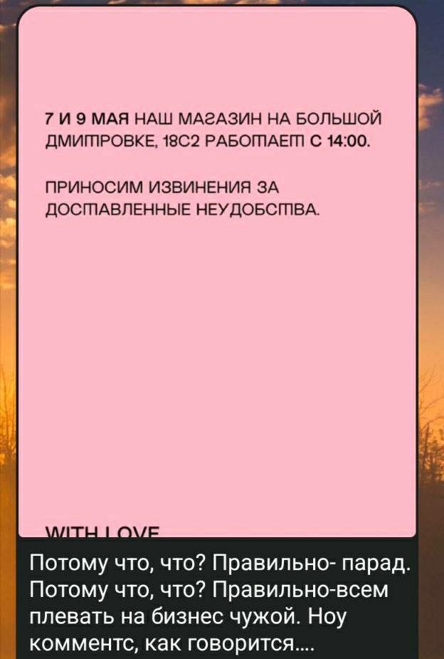 У Monochrome беда — урон бизнесу из-за парада в честь Дня Победы... Уже всё потерли и комментарии закрыли.