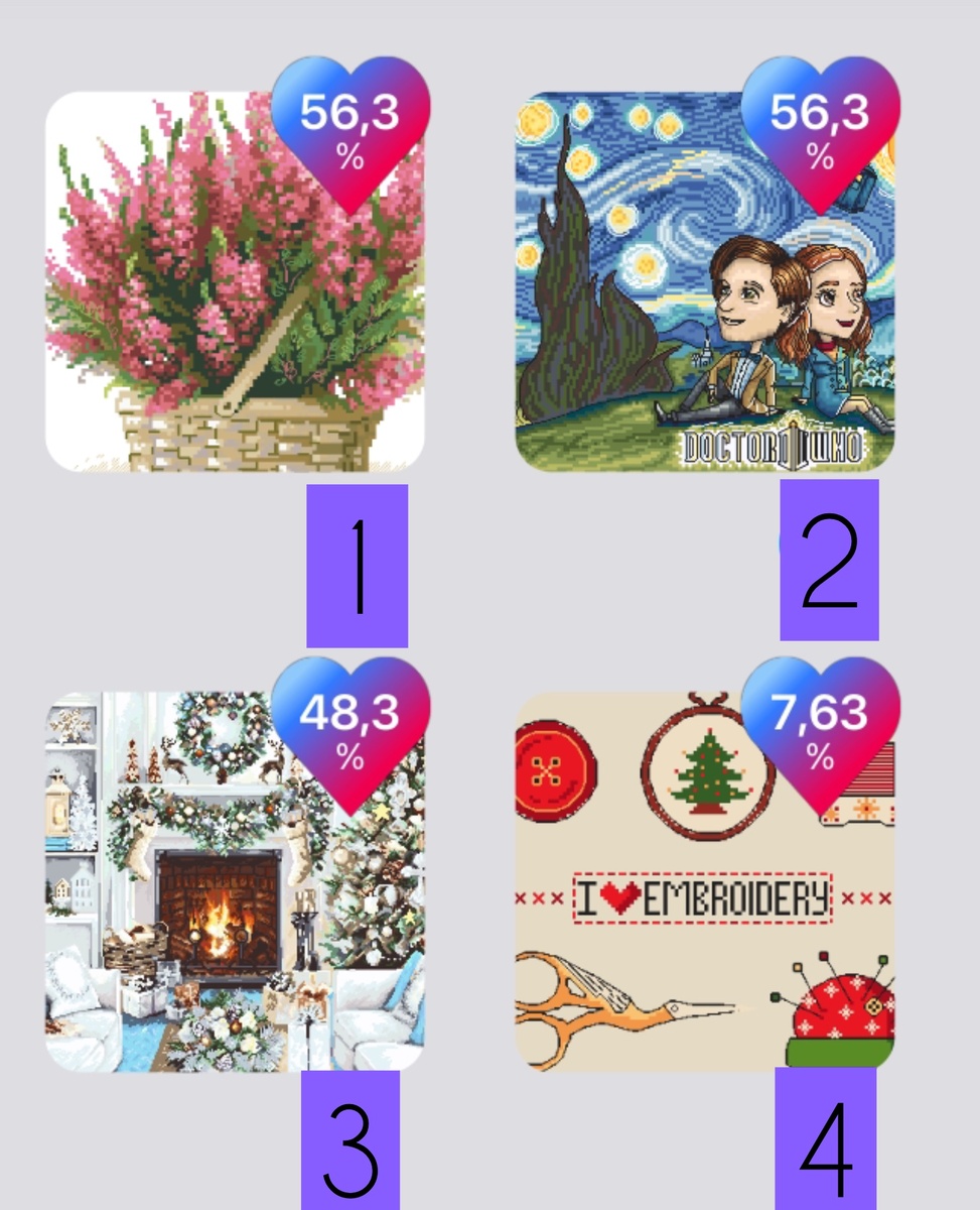 Всем привет) Наступила среда, а это значит, что вы снова можете повлиять на то, что я буду вышивать на выходных. 🛑стоп🛑 в комментариях объявлю в пятницу. На этой неделе игроки те же: 1- «Шотландский вереск» от Риолис 2- «Доктор Кто» от Инны Лупановой 3- «Рождественский интерьер» от Luca’s 4- «I love embroidery» от Екатерины Спиридоновой Выбор за вами 💙