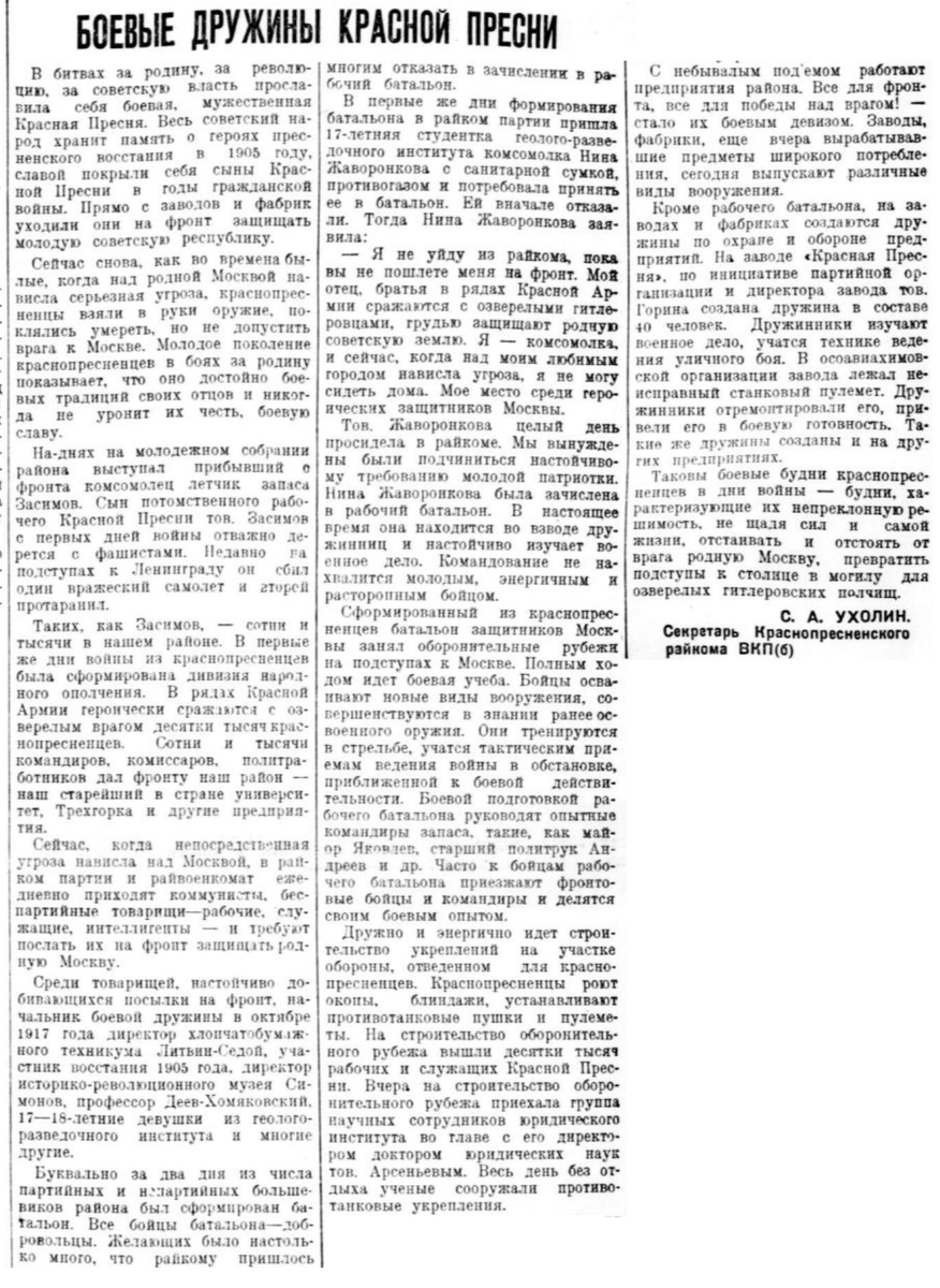 Таких, как Засимов, — сотни и тысячи в нашем районе. В первые же дни войны из краснопресненцев была сформирована дивизия народного ополчения. В рядах Красной Армии героически сражаются с озверелым врагом десятки тысяч краснопресненцев. Сотни и тысячи командиров, комиссаров, политработников дал фронту наш район — наш старейший в стране университет, Трехгорка и другие предприятия.