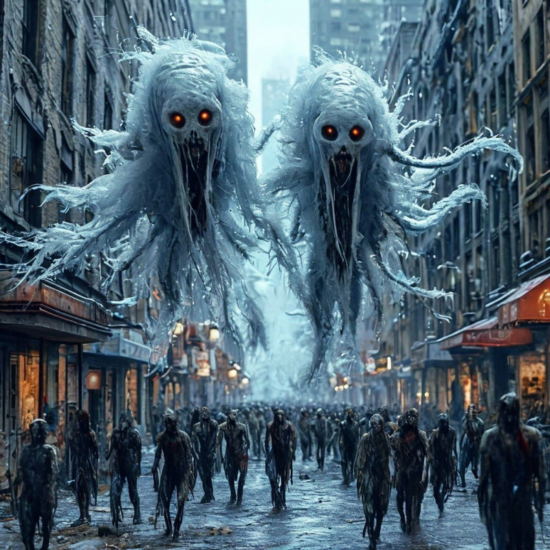 Мертвые не умели удивляться, и не знали страха. Фобоса и Деймоса не волновала способность мертвецов бояться, потому что волнение не входило в число доступных им эмоций, они делали то, для чего были созданы – истребляли все, что попадалось им на пути. Белые «мантии» пришельцев, подобные хвостам снежных драконов, мелькали в глубине мертвецкой фаланги. Улица наполнилась низким гулом, похожим на шум двигателей взлетающего самолета. Ирвинг, словно приросший к своему «наблюдательному посту», закрыл уши руками, иначе бы его барабанные перепонки не выдержали и лопнули. Количество дыр в воздухе росло с каждой секундой, они накладывались одна на другую, и скоро та часть дороги, где происходила битва, полностью превратилась в картину подсевшего на гипнозорал художника-сюрреалиста. Половина квартала начинала проваливаться в иное пространство, наполненное крутящимся снежным хаосом.