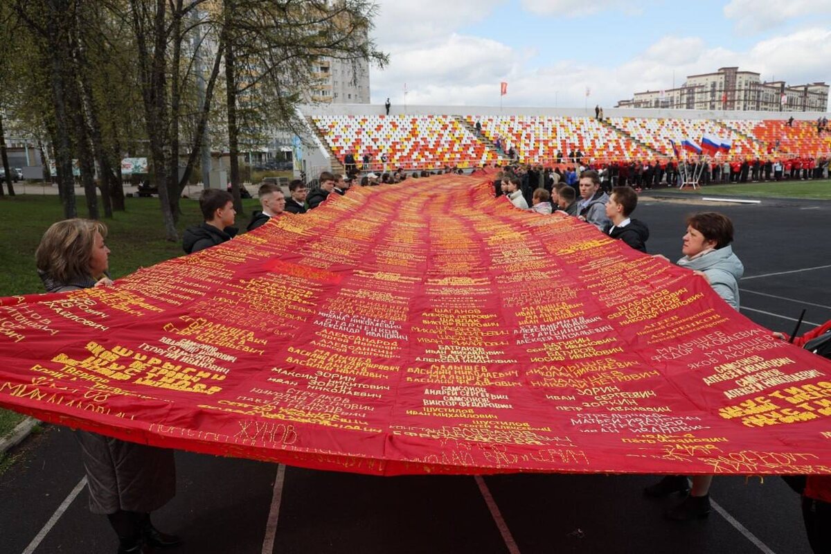 В Сергиевом Посаде развернули «Знамя памяти» с именами 9211 земляков, погибших в годы Великой Отечественной войны «Лоскутки с 9211 фамилиями наших земляков, взятыми из 23 тома Книги Памяти Правительства Московской области, были сшиты в единое «Знамя памяти» школьниками и их родителями, а также неравнодушными жителями Сергиево-Посадского округа. Каждый из них стал причастным к сохранению памяти о героизме солдат, подаривших нам Великую Победу восемьдесят лет назад. После торжественного мероприятия «Знамя памяти» передали на хранение в Народный музей боевой славы 16(249)-й Гвардейской Карачевской стрелковой дивизии школы №8»,- информационная служба администрации округа.
