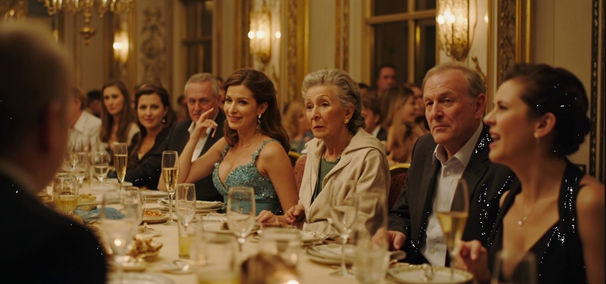 Все гости захохотали, и даже официант, державший поднос с тарталетками, едва не уронил посуду. Наталья Леонидовна за минуту приняла на себя все оттенки красного — от томатного соуса до варёной креветки. Казалось, ещё секунда — и из её ушей пойдёт пар.