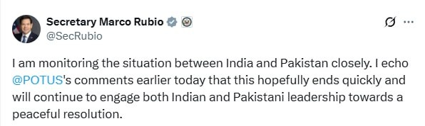 Rubio says he’s in touch with Indian and Pakistani leadership, US ‘seeking a peaceful resolution’