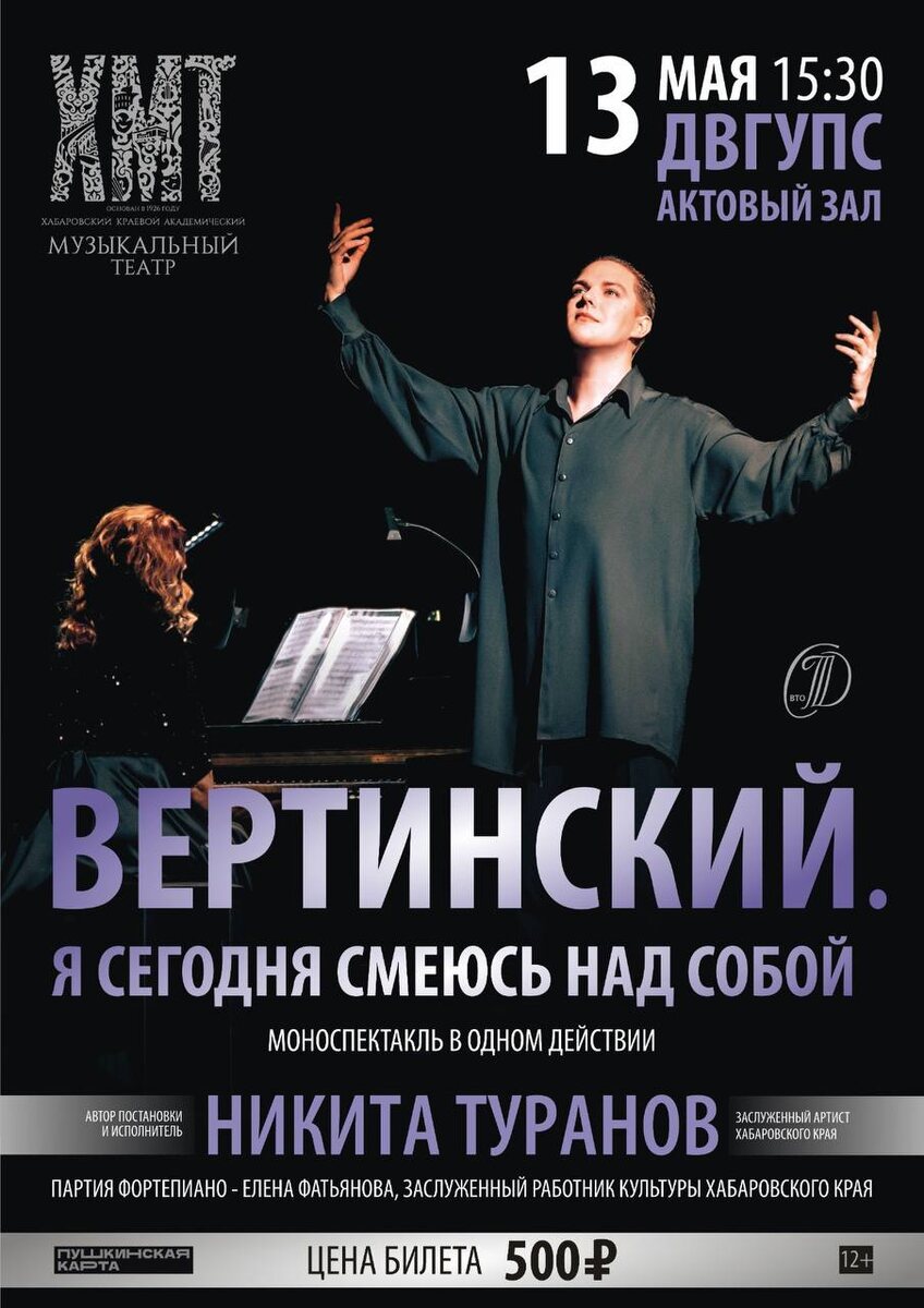 🎭 Моноспектакль «Вертинский. Я сегодня смеюсь над собой» в ДВГУПС! 📅 13 мая в 15:30 📍 Актовый зал ДВГУПС Хабаровский краевой академический музыкальный театр представляет моноспектакль в одном действии, посвящённый творчеству легендарного Александра Вертинского 🌟 В главной роли: Никита Туранов, заслуженный артист Хабаровского края 🎹 Партия фортепиано: Елена Фатьянова, заслуженный работник культуры Хабаровского края Погрузитесь в атмосферу изысканной музыки, поэзии и тонкого юмора, где каждая нота и каждое слово — дань уважения великому артисту Стоимость билетов: 500 руб. Приобрести можно по Пушкинской карте https://www.ticketland.ru/specialSale/?code=sAPFJj3KCnBvWAW_ Успейте забронировать билеты и провести этот день в мире искусства!