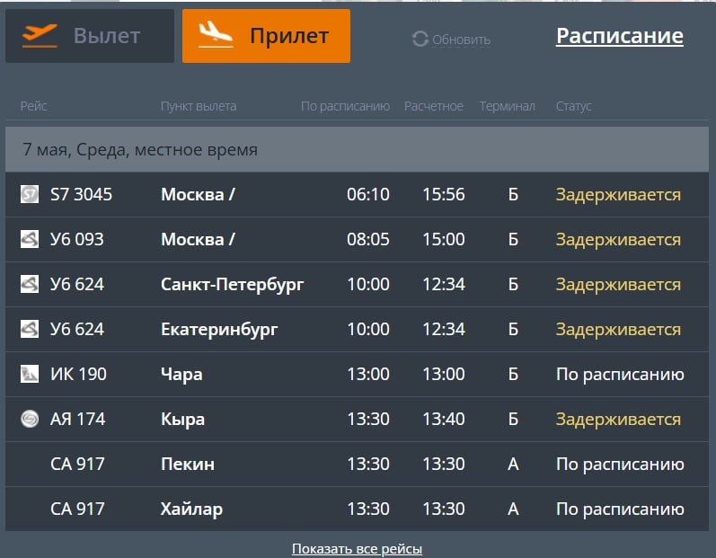 🟦На сайте читинского аэропорта указано, что рейс компании S7, который должен был прилететь в 6:10, будет в Забайкалье в 15:56.