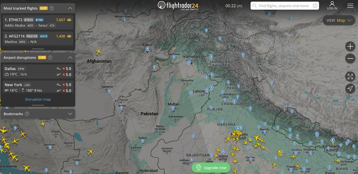 Airspace over Pakistan and parts of India is nearly empty amid clashes between the nuclear-armed neighbors, with only one flight, an Ethiopian Airways jet bound for South Korea, remaining in the skies, according to Flightradar24 data #India