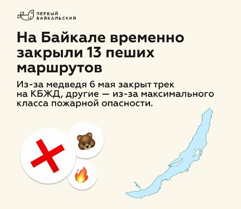 🚫 В Прибайкальском нацпарке закрыли еще два популярных пешеходных маршрута — тропу вдоль КБЖД и трек «Север острова Ольхон» Причины разные: на Кругобайкале — повышенная вероятность встречи с медведем, на острове — максимальный класс пожароопасности. 🔴Оба маршрута закрыты на неопределенный срок. 📎 На сайте собрали все 13 троп, где прогулки сейчас недоступны → https://1baikal.ru/novosti/iz-za-medvedya-6-maya-dlya-turistov-zakryli-marshrut-na-kbzhd