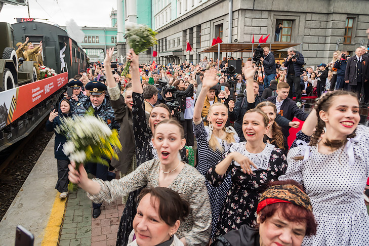 В рамках празднования 80-летия Победы в Великой Отечественной войне по стране курсирует тематический ретро поезд «Эшелон Победы». Утром 7 мая он совершил остановку в Новосибирске. Праздничный поезд на первом пути вокзала Новосибирск-Главный встречали сотни жителей столицы Сибири под музыкальное сопровождение военного оркестра. В состав эшелона вошли легендарный паровоз серии Л-620, вагоны-музеи с экспозицией о военной истории России, санитарный вагон, вагон-теплушка и платформа с образцами военной техники. Перед прибытием эшелона рядом с пригородным вокзалом прошла тематическая акция «Вальс Победы». Также в этот день у вокзала работают интерактивные тематические площадки, фотозоны, мастер-классы. Волонтеры раздают копии выпуска газеты «Гудок» 1945 года. «Вот уже десять лет в канун 9 мая у нас есть прекрасная возможность прикоснуться к тем эмоциям, которые переживали наши прадеды, деды, отцы, представители Поколения победителей, 80 лет назад. В майские дни 1945 года на перронах всех вок