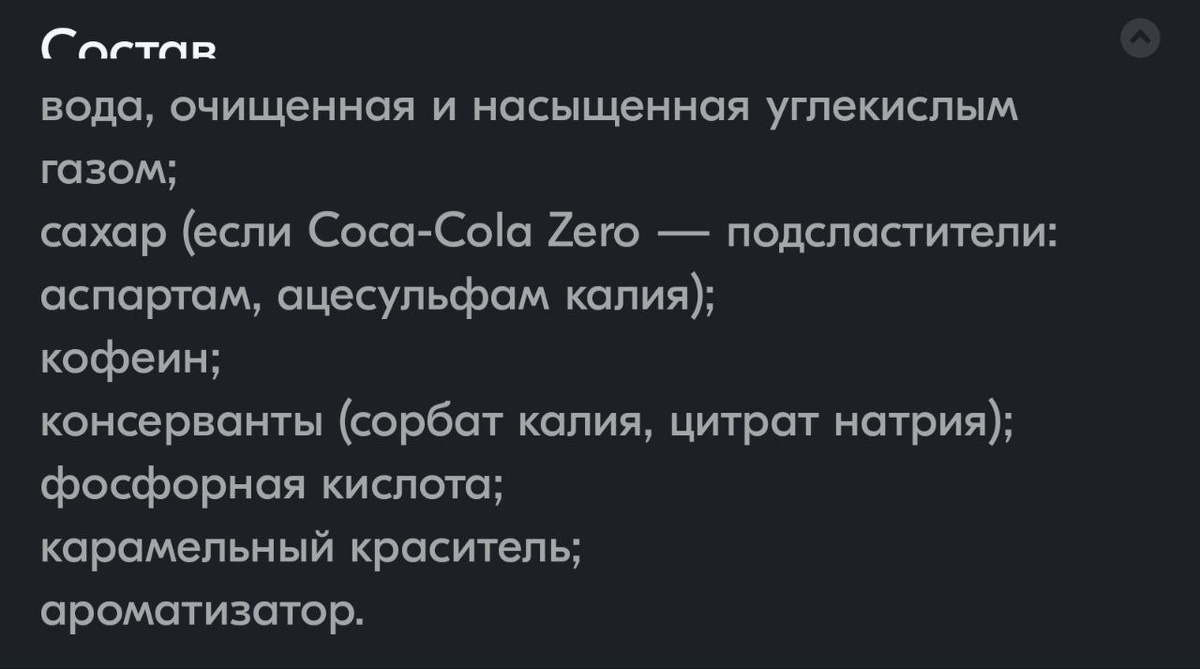 Сегодня разберём легендарный напиток. Каждый хотя бы раз в жизни его попробовал, кому-то он очень нравится, кто-то его на дух не переносит. Давайте же заглянем внутрь и посмотрим, из чего он состоит. Состав: Вода очищенная и насыщенная углекислым газом. Скорее всего, самый лучший ингредиент в этом напитке. Сахар (если Coca-Cola Zero — подсластители: аспартам, ацесульфам калия). Как всегда, огромное количество сахара. Примерно две чайные ложки на 100 мл продукта. Попробуйте дома отмерить 100 мл воды, размешать в них две чайные ложки сахара без горки и выпить. Напишите в комментариях, какой был результат. Версия без сахара ничем не лучше, например, аспартам в больших количествах вызывает нарушение памяти, головные боли, нарушение гормонального баланса. Кстати, рекомендуемая порция употребления кока-колы в день — 200 мл. Вы когда-нибудь видели, чтобы её так мало пили? ))) Кофеин. Содержание кофеина на первый взгляд низкое, но есть подвох. Когда мы пьём чашечку американо, 100-125 мг