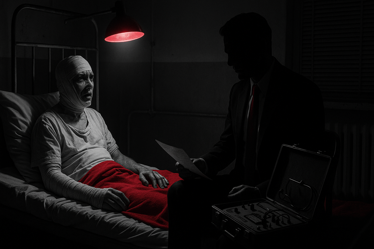 С его точки зрения — десять вечера. В палату вошёл незнакомец в чёрном костюме со злобной миной и с кейсом, который сам вопит «плохие новости». Наверное, думает, что я страховку проверяю. Или почку украсть пришёл.