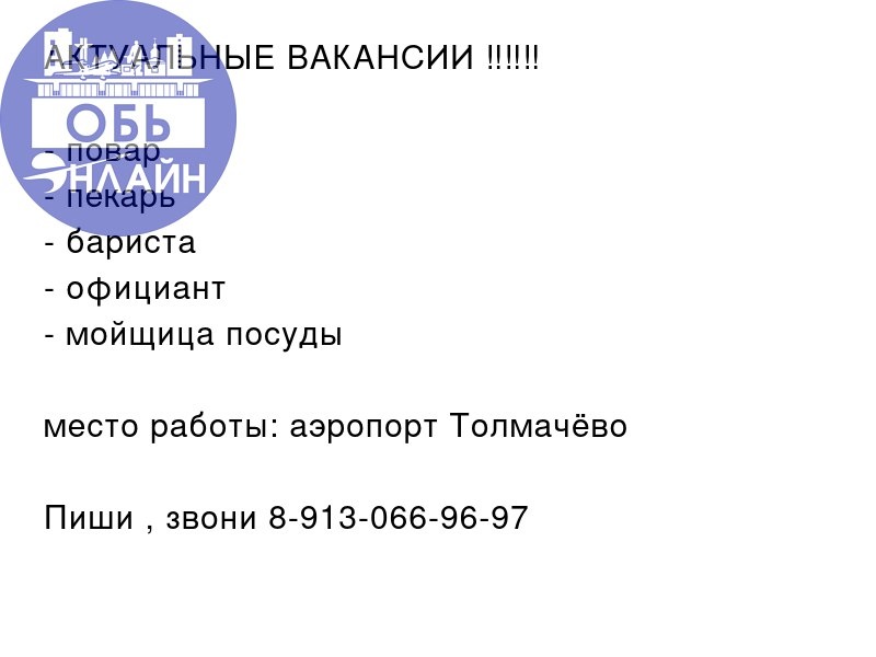 ↗ АКТУАЛЬНЫЕ ВАКАНСИИ ‼️‼️‼️ - повар - пекарь - бариста - официант - мойщица посуды место работы: аэропорт Толмачёво Пиши , звони 8-913-066-96-97 #Reklama@ob.gorod vk.com Подробнее на https://vk.com/ob.gorod #городобь #городобьонлайн #толмачево