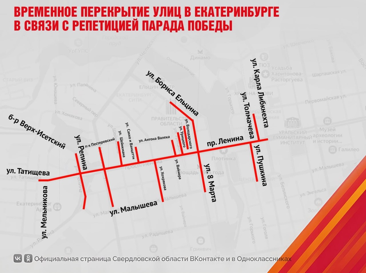Центр Екатеринбурга перекрыт с 4.00 утра до 12.00 дня Причина — генеральная репетиция Парада Победы. Запрет коснётся всех видов транспорта, включая самокаты и каршеринг. Водителей просят заранее искать пути объезда. @zg66