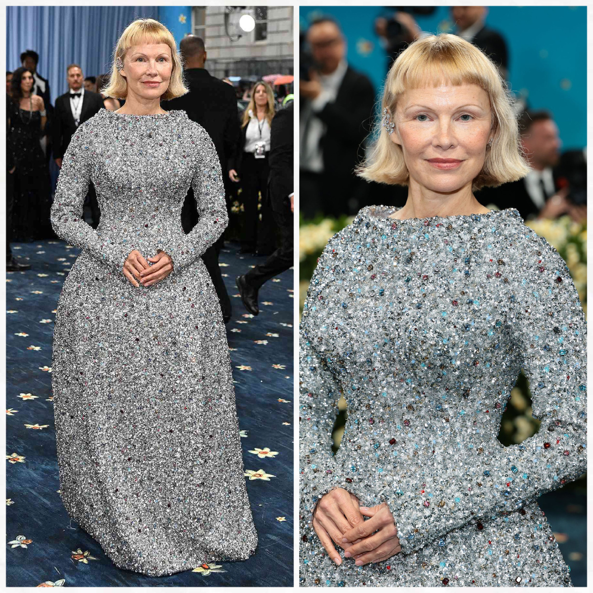 Met Gala последние годы — это как соревнование «кто кого шокирует сильнее». Личное мнение: 6-7 лет назад мне было интереснее смотреть это мероприятие. Эпатаж был, но многие старались выдержать баланс. Можете посмотреть в интернете Met Gala 2018, к примеру. Ладно, всё это лирика. Переходим к нарядам. Если говорить честно, то я узнала её не сразу. Первое, что бросилось в глаза — стрижка. Чёлка такая ровная, что кажется, её вымеряли лазером. Возможно, это такой план: «пусть все обсуждают мою челку, а не возраст». Следующее — отсутствие макияжа. К такому платью он необходим. И если уж Памела взяла курс на естесвенность, то лучше было бы надеть однотонное платье с мягкими струящимися линиями. Белая блузка, яркая юбка с вырезом, высокие каблуки, высокий хвост.. Ну хороша же! Крупное ожерелье и крупные кольца дополняют наряд и выглядят гармонично. Но только для сего мероприятия Энн выглядит «не в дресс-коде». Платье в пол с пайетками, принтом и декором в виде «нимба». Общая композици