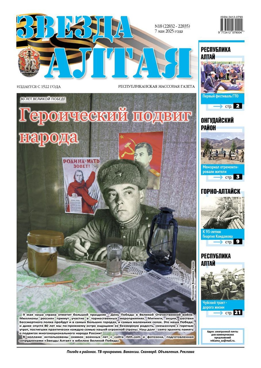 ⭐️️Свежий номер «Звезды Алтая» уже поступил в продажу! 🔹Скоро мы отпразднуем День Великой Победы. Основную часть выпуска составили материалы, посвященные памяти наших земляков, которые вместе со всем советским народом героически боролись за мир на земле. 🔹Наш Бессмертный полк. Мы, сотрудники «Звезды Алтая», решили рассказать на страницах газеты о своих отцах, дедах и бабушках, прошедших через ту страшную войну. 🔹Солдат Модыш из рода тёлёс. Иван Белеков рассказал о судьбе своего отца тестя – фронтовика Модыша Адарова. 🔹Ученый. Педагог. Поэт. Читайте материал, посвященный 95-летию Георгия Васильевича Кондакова. 🔹Чуйский тракт – дорога жизни. Прочитайте, как главная дорога Алтая помогла приблизить Победу. 🗞☕️В новом выпуске нашей газеты вы найдёте много интересной и актуальной информации! ❗️Спрашивайте газету в магазинах города. Приобрести ее можно и непосредственно в редакции (Горно-Алтайск, ул. Чорос-Гуркина, 38).