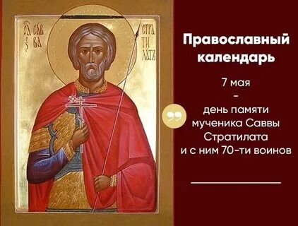 7 мая 2025 года - среда, неделя 3-я по Пасхе В этот день Русская Православная Церковь чтит память: — Мученика Саввы Стратилата и с ним 70-ти воинов (272) — Преподобного Саввы Печерского, в Ближних пещерах (XIII) — Мученика Сергия Архангельского (1938) ------------------------------------------- 💞 Сегодня именины празднуют: Савва, Алексий, Александр, Пасикрат, Валентин, Евсевий, Неон, Леонтий, Лонгин, Фома, Симеон, Бранко, Сергий, Елисавета Поздравляем всех именинников с днем Ангела! Желаем им крепкого здоровья, духовной радости и Божьего благословения. ------------------------------------------- 🍵 ПОСТ И ТРАПЕЗА 7 мая 2025 г., среда, день постный ------------------------------------------- 💠ИСТОРИЧЕСКИЕ СОБЫТИЯ — 7 мая 1755 г. в Императорском Московском университете началось обучение студентов — 7 мая 1780 г. императрица Екатерина II официально жаловала герб Санкт-Петербургу — 7 мая 1940 г. Московскому государственному университету присвоено имя Михаила Ломоносова — 7