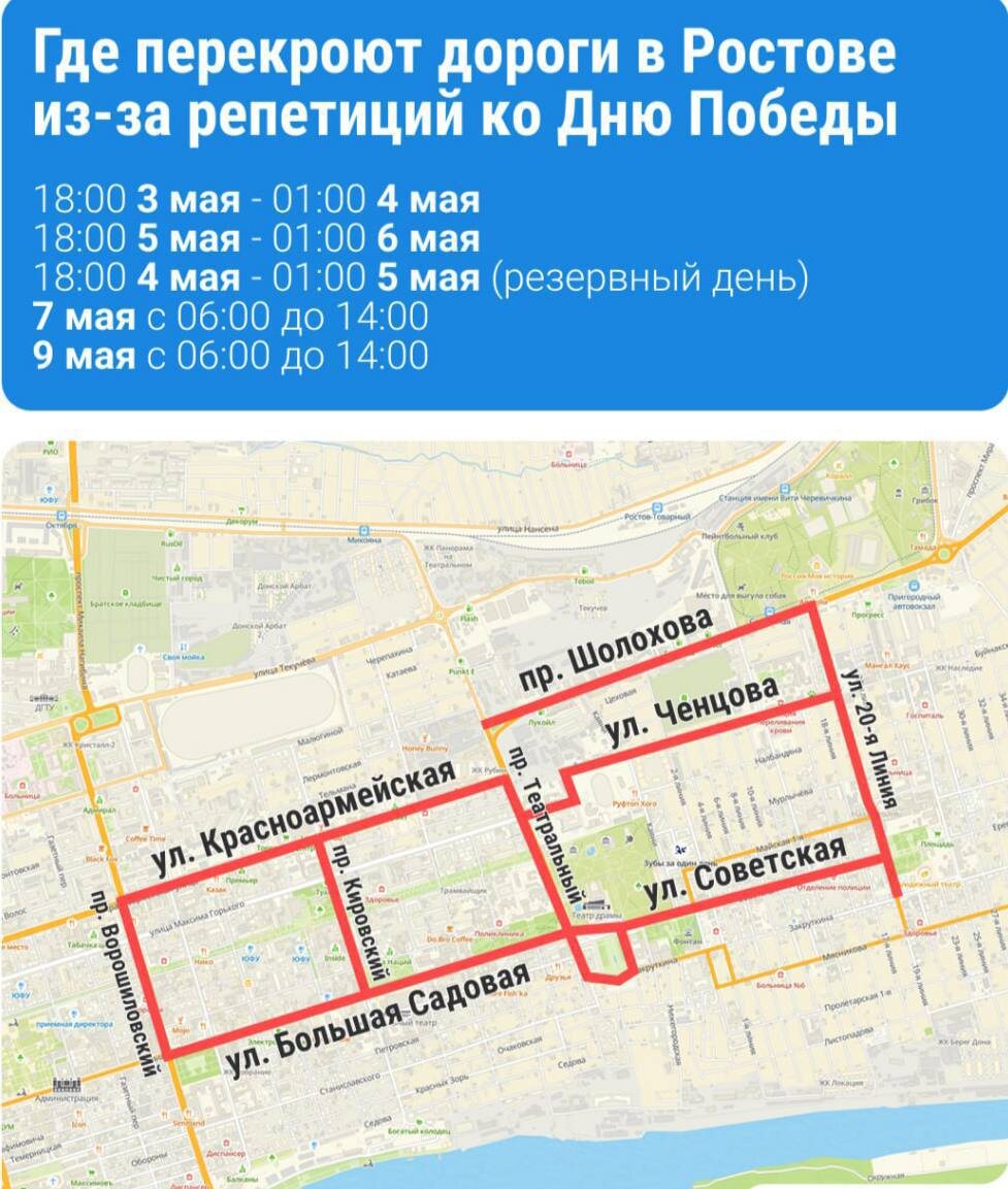 Напоминаем, что сегодня в Ростове из-за генеральной репетиции Парада Победы с 6:00 до 14:00 перекроют движение: ⛔по 20-й линии на участке от Шолохова до площади Карла Маркса; ⛔ по Советской от площади Карла Маркса до Театральной площади; ⛔по Театральной площади, проспекту Театральному на участке от Максима Горького до Социалистической; ⛔ по Максима Горького/ул. Ченцова на участке от Крепостного до Каяни; ⛔по Большой Садовой от Театральной площади до Ворошиловского. Также на момент прохождения механизированной колонны будет ограниченно движение транспорта по Шолохова, 20-й линии, площади Карла Маркса, Большой Садовой, Ворошиловскому, Красноармейской, Театральному, Ченцова, Кировскому. 👉🏻Новости №1 в Ростове 💌Прислать новость/фото