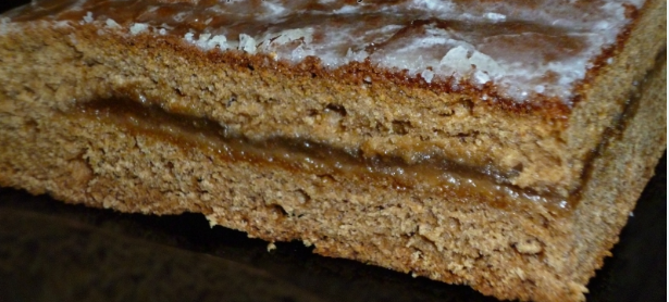 Ингредиенты: Тесто: - 1 стакан сахара - 2 яйца - 100 г сливочного масла - 1 ч. л. соды - 1 ст. л. молотой корицы - 2-3 ст. л. меда Глазурь: - 4 ст. л. сахара - 2 ст. л. воды Приготовление: Тщательно смешать все компоненты для теста и прогреть на водяной бане около 10 минут, постоянно помешивая до полной однородности. Затем постепенно добавить просеянную муку — ровно столько, сколько нужно для формирования мягкого, пластичного теста. Из полученного теста сформировать два тонких слоя (коржа). Противень слегка промазать сливочным маслом. Один слой теста выложить первым, равномерно намазав на него джем или повидло, поверх уложить второй слой. Края аккуратно соединить с помощью вилки и отправить форму в разогретую духовку для запекания при умеренной температуре. Перед окончанием приготовления подготовить глазурь. Сразу после извлечения готового изделия из печи горячим покрыть глазурью.