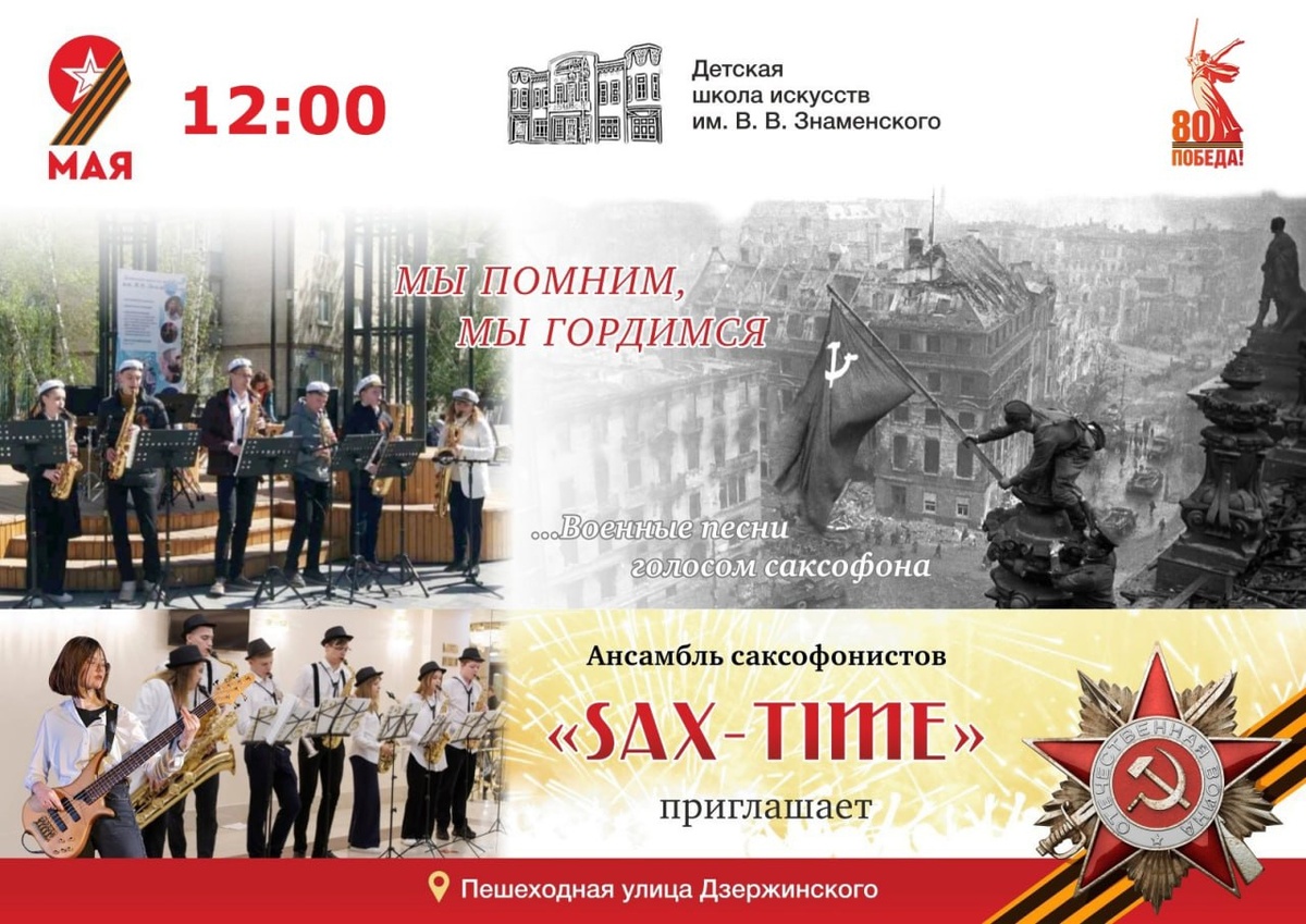 Дорогие друзья! Приглашаем вас на незабываемый концерт ансамбля саксофонистов Sax-Time под руководством Марины Владимировны Винокуровой! 9 мая в 12 часов на пешеходной улице Дзержинского прозвучат любимые песни и музыка военных лет в современном исполнении. Этот праздничный концерт – дань памяти и уважения нашим героям, отстоявшим мир и свободу. Приходите всей семьёй, чтобы вместе почувствовать силу музыки, которая объединяет поколения! «Мы помним! Мы гордимся!» – пусть эти слова звучат в наших сердцах! Организатор: детская школа искусств им. В.В. Знаменского. До встречи на празднике Великой Победы!