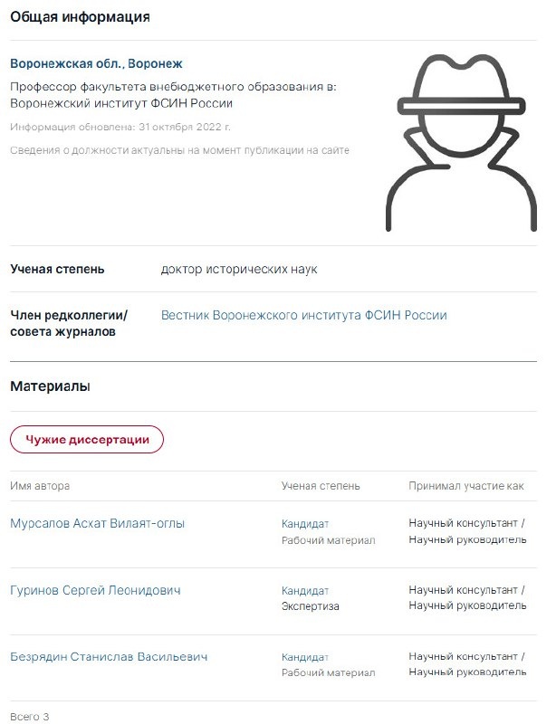 Ливенцев Дмитрий Вячеславович Профессор факультета внебюджетного образования в: Воронежский институт ФСИН России https://www.dissernet.org/person/LivencevDV