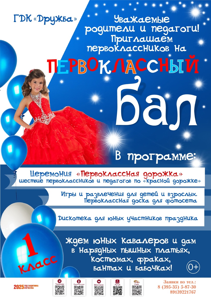 Уважаемые родители и педагоги! Первоклассный бал — это важное и волнующее событие, которое требует тщательной организации и профессионального подхода. Дворец культуры «Дружба» гарантирует высокий уровень мероприятия! Для первоклассников мы подготовили яркую программу, которая включает в себя стильную церемонию «Первоклассная дорожка», игры и развлечения для взрослых и детей, дискотеку для юных участников праздника. Мы внимательно продумываем каждый момент сценария, чтобы маленькие участники чувствовали себя комфортно и ушли с незабываемыми впечатлениями. С удовольствием встретимся с вами, чтобы обсудить все детали и сделать Бал первоклассников поистине особенным! Тел.: 8395-35-5-87-30, 89139221767.