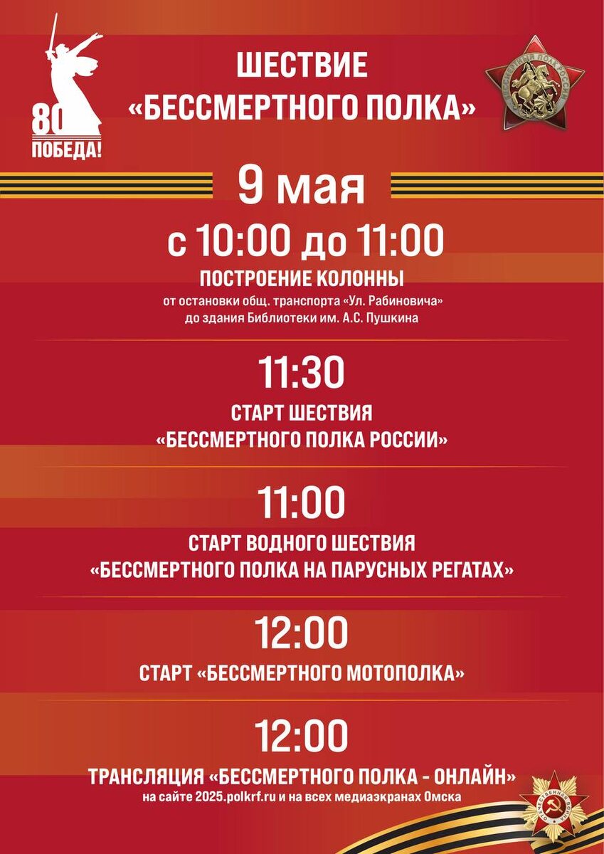 Публикуем афишу шествия «Бессмертного полка» в Омске. И еще раз напоминаем о том, что для удобства жителей на базе РЦСО (ул. Красный путь, 9, кабинет 117) работает штаб, где омичи могут дополнительно получить информацию о месте и времени проведения шествия, а также помощь в бесплатном изготовлении портретов родных-фронтовиков. Волонтеры помогают отсканировать фотографию, ведь у многих они сохранились в печатном носители и нет электронных версий, еще одним из функционалов – это создания через конструктор стилизованной фоторамки на сайте polkrf.ru Штаб работает ежедневно до 10 мая с 15:00 до 19:00. Телефон для связи: 8-983-113-93-34