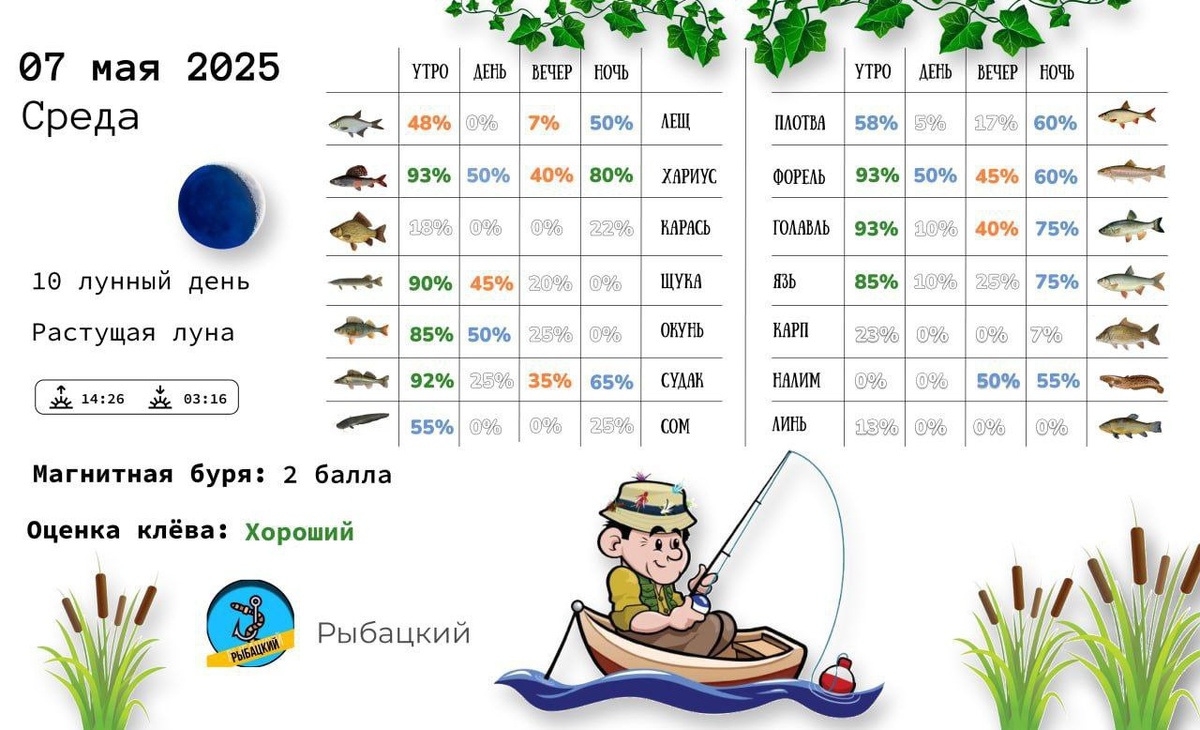 Прогноз клёва на 7 мая по фазе и состоянию луны✅ На заметку❗️ Быстрая прибыль воды с сильным помутнением может ослабить клев судака в мае вплоть до полного его прекращения❌ Но если вода в мае начинает понемногу спадать, а видимость ее достигает хотя бы полметра, можно начинать ловлю клыкастого. Полметра – это вывод из рыболовной практики👌