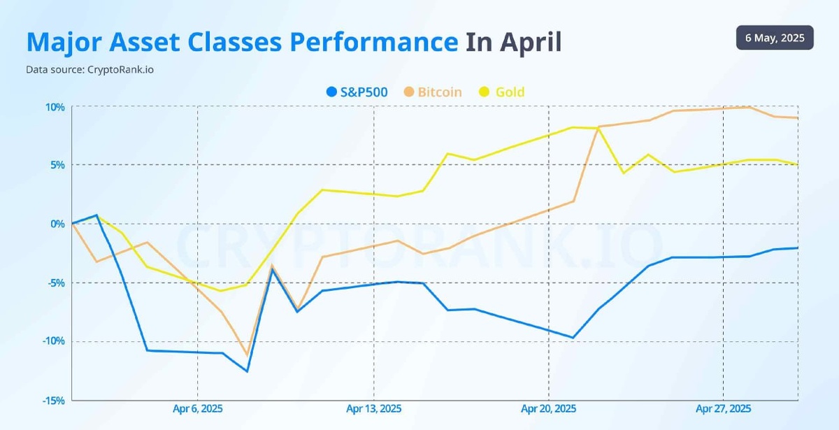 πΈΠΠ°ΠΊ Π²ΠΈΠ΄Π½ΠΎ ΠΈΠ· Π³ΡΠ°ΡΠΈΠΊΠ°, Π² Π°ΠΏΡΠ΅Π»Π΅ Π±ΠΈΡΠΊΠΎΠΈΠ½ ΠΏΠΎΠΊΠ°Π·Π°Π» Π»ΡΡΡΠΈΠ΅ ΡΠ΅Π·ΡΠ»ΡΡΠ°ΡΡ, ΡΠ΅ΠΌ Π·ΠΎΠ»ΠΎΡΠΎ ΠΈ S&P 500, Π½Π΅ΡΠΌΠΎΡΡΡ Π½Π° ΡΡΡΠ΅ΡΡΠ²Π΅Π½Π½ΠΎΠ΅ ΠΏΠ°Π΄Π΅Π½ΠΈΠ΅ Π² Π½Π°ΡΠ°Π»Π΅ ΠΌΠ΅ΡΡΡΠ°