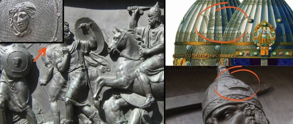 Замечу лишь, что на постаменте памятника Минину и Пожарскому есть барельеф, где Пожарский изображён в шлеме "иерихонка" — уникальном головном уборе с тремя коронами, который был создан лишь через 9 лет после событий 1612 года. И это явно не случайность, а намеренное скрытие факта. Этот шлем просто не мог быть на нем в тот момент. Кроме того, на щите Пожарского изображена Медуза, символ, который не имеет отношения к русской культуре и явно указывает на языческие корни. И такие неточности не могут являться простыми ошибками в исторической интерпретации.