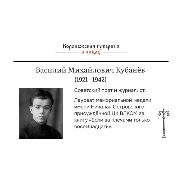 📚✍ Василий Кубанёв — поэт, который научился читать в четыре года и неустанно искал слова, чтобы рассказать свою историю! Жизнь Василия была полна испытаний: с детства он пережил потери, болезни и репрессии, но его несгибаемый дух помогал ему идти вперёд. Уже в четыре года он начал читать — благодаря своей тёте-учительнице, которая обучала его как в игре. 🇫🇷📖 Василий не просто писал стихи — он жил ими! Уже в 12 лет он получил первую премию за творчество, а к 16 годам его имя стало известно в писательских кругах. Он дружил с известными литераторами и постоянно учился — даже самостоятельно освоил французский язык! Несмотря на слабое здоровье и войну, Василий не переставал стремиться к знаниям и творчеству. Его стихи хвалил сам Корней Чуковский и преподаватели из Ленинграда. К сожалению, жизнь поэта оборвалась слишком рано — в 21 год из-за болезни, осложнённой тяжёлыми условиями войны. Но память о нём живёт в книгах, памятниках и в сердцах тех, кто ценит талант и силу духа. 📚 Се