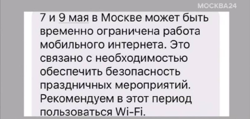 ❗️❗️Ограничение работы интернета в праздники Доброе утро среды с вайбом пятницы 👋 Вы наверняка уже слышали новости про ограничение работы интернета 7 и 9 мая. Я хотела бы в этой связи напомнить о следующих важных моментах: ❗️Все билеты и регистрации на праздничные мероприятия лучше распечатывать заранее; ❗️Не забываем брать в театры паспорта и свидетельства о рождении; ❗️Планируем все маршруты заранее, чтобы не попасть на перекрытие; ❗️Обратите внимание, что 7 и 9 мая также будут закрыты кафе и магазины в центре, которые будут находится в зоне перекрытий; ❗️Рекомендую снять наличку заранее и расплачиваться наличкой в эти дни. ❗️Подарки от Миллиона призов с Тверской площади забираем 10 и 11 мая. ❗️❗️Если хотите воспользоваться моим пристроем, то пишите мне заранее, чтобы успеть переоформить билет. UPD: Если вы, как и я, «удачно» записались в поликлинику, берите с собой оригиналы медицинских полисов. ЕМИАС не работает в поликлинике.