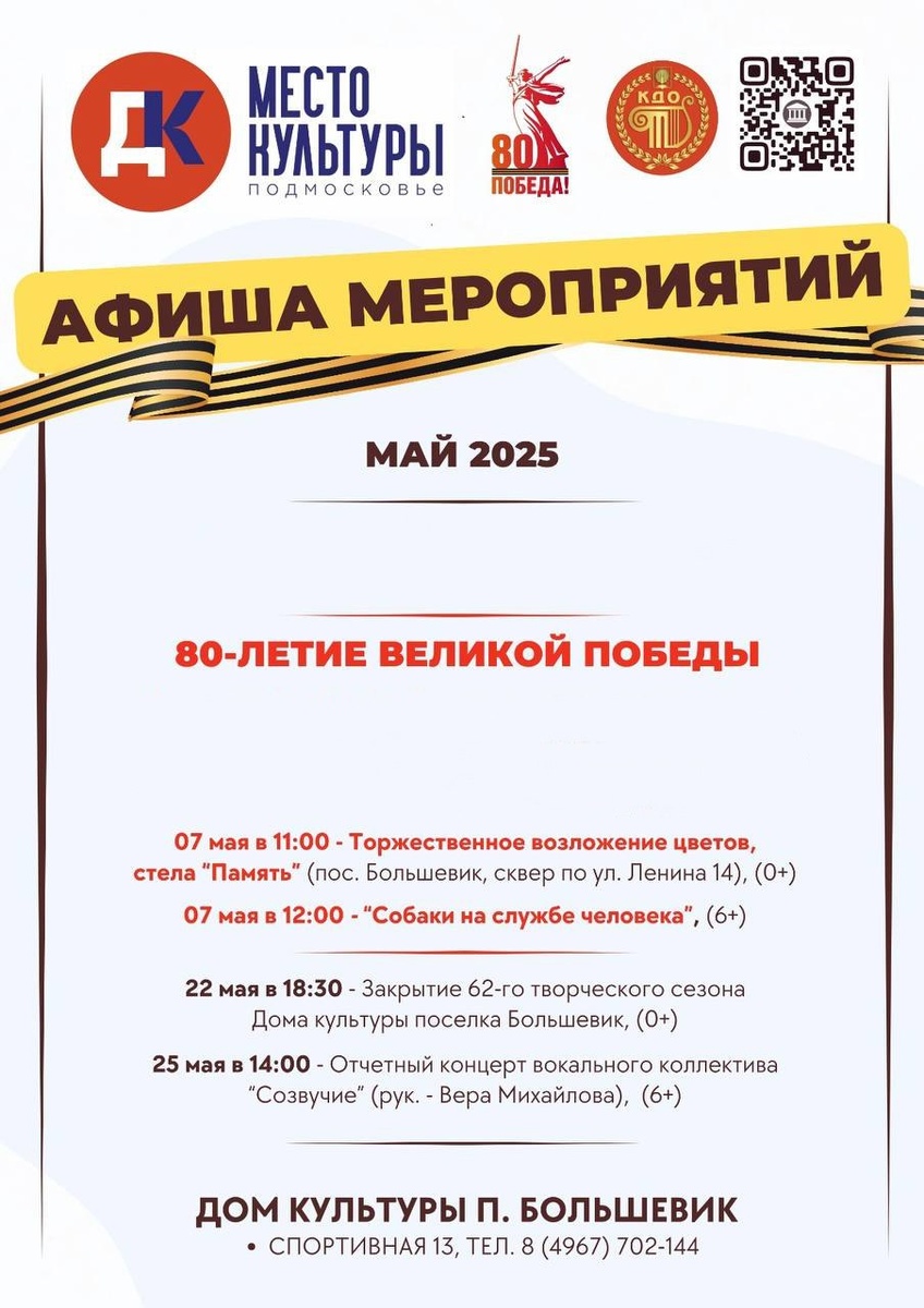 ✨ Мероприятия в мае в ДК "Большевик" 🔻7 мая в 11:00 - торжественное возложение цветов 🔻7 мая в 12:00 - собаки на службе человека 👉А 22 мая закрытие сезона, а 25 мая отчётный концерт 📆 07.05.2025 🏢 ДК "Большевик" 📍 г.о. Серпухов, пос. Большевик, ул. Спортивная, д.13 💰 Вход свободный❗️ #webСерпухов ✅ Мероприятия Серпухов https://dzen.ru/id/66f01c6eb4c6fe60c9ca1608 http://vk.com/serpukhov_events http://dzen.ru/serpukhov_events
