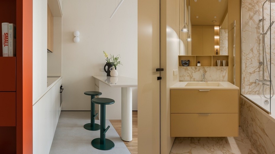 Апартаменты предназначены для аренды и находятся в ЖК в центре Москвы. Дизайнер создала небанальное минималистичное пространство с яркими акцентами. Фото: Ольга Мелекесцева Эти апартаменты приобретены в инвестиционных целях — под сдачу в аренду. Недвижимость находится в комплексе в центре Москвы. Было необходимо выделить объект на фоне других, создать функциональный интерьер с минималистичным дизайном. С этой задачей справилась дизайнер Даниля Хутбеева. В соответствии с Жилищным кодексом РФ требуется согласование проводимых переустройств и перепланировок. Изначальная планировка апартаментов классическая для современного рынка недвижимости — кухня-гостиная, маленькая спальня и санузел. Даниля предложила небольшую перепланировку. Так, от кухни-гостиной «забрали» часть площади под гардеробную с функцией постирочной. Вход в спальню перенесли, чтобы сделать проход в кухню-гостиную просторнее. Достроили перегородку для встройки шкафа в спальне. Для стен выбрали светлую краску песочного цвета