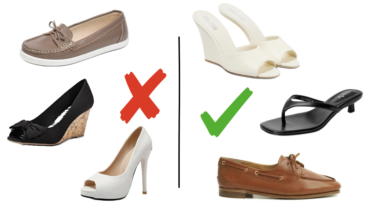 Мокасины - еще один типично летний вариант обуви, который много лет назад все повально носили. Помню, когда я еще только начинала профессионально заниматься темой стиля (шел 2013 год), я уже тогда объясняла своим клиенткам, что мокасины (именно настоящие мокасины, а не их подобие) - очень спорная обувь с точки зрения визуальной коррекции фигуры. Они точно не помогают тогда, когда стоит задача облегчить силуэт. Почему? Потому что часто они выглядят как стоптанная и «продавленная под весом» обувь. А это не добавляет легкости даже на уровне ассоциаций. И если уже выбирать подобную обувь, тогда у нее должна быть хорошо сформирована пятка, а еще желательно, чтобы был небольшой каблук - хотя бы пару сантиметров. В общем-то получаются типичные лоферы.
