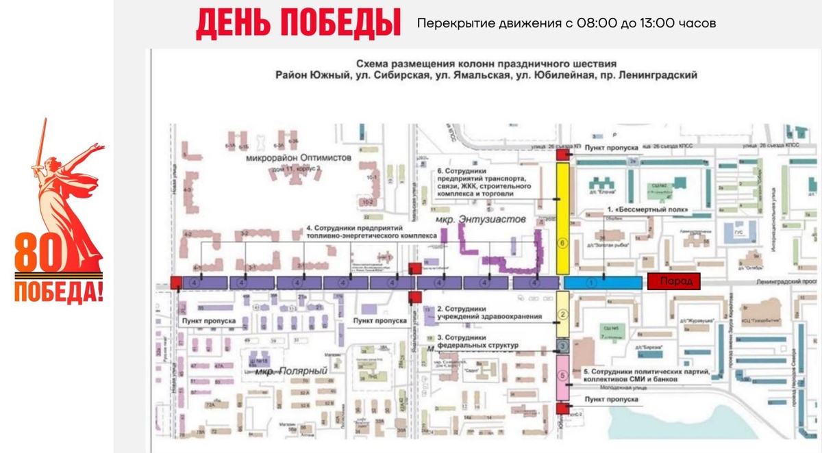 📍 Делимся схемой размещения колонн праздничного шествия «Бессмертный полк России» Также обращаем внимание, что организовано 5 входных групп: ➡️на пересечении улиц 26 Съезда КПСС и Юбилейная; ➡️ на улице Юбилейная в районе озера Молодёжное; ➡️ на улице Ямальская в районе Богоявленского собора; ➡️ на улице Ямальская в районе Южного рынка; ➡️ на пересечении улиц Новая и Сибирская. * входные группы отмечены на карте красным цветом. ❤️ НУР. Официально