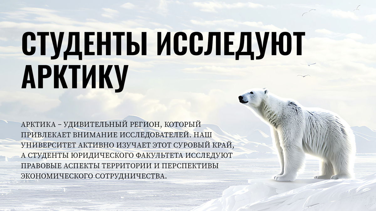 Арктика – удивительный регион, который привлекает внимание исследователей. Наш университет активно изучает этот суровый край, а студенты юридического факультета исследуют правовые аспекты территории и перспективы экономического сотрудничества. Даниил Ермолин: «Исследованием Арктического региона я заинтересовался сравнительно недавно – примерно полгода назад. Это произошло после того, как я узнал о проведении крупного Арктического форума на базе Санкт-Петербургского отделения РАН. Меня сразу привлекла актуальность этой темы. На международной студенческой конференции, выступая на секции, посвященной Арктике, я отметил, что это не просто ледяная пустыня, а ключ к экономической и геополитической мощи России. Мое первое полноценное исследование по этой теме - «Правовые вопросы укрепления потенциала российского судостроения для целей хозяйственного освоения и развития Арктики». В рамках своей работы я провел анализ программ развития морского флота России, изучил положения Транспортной страте