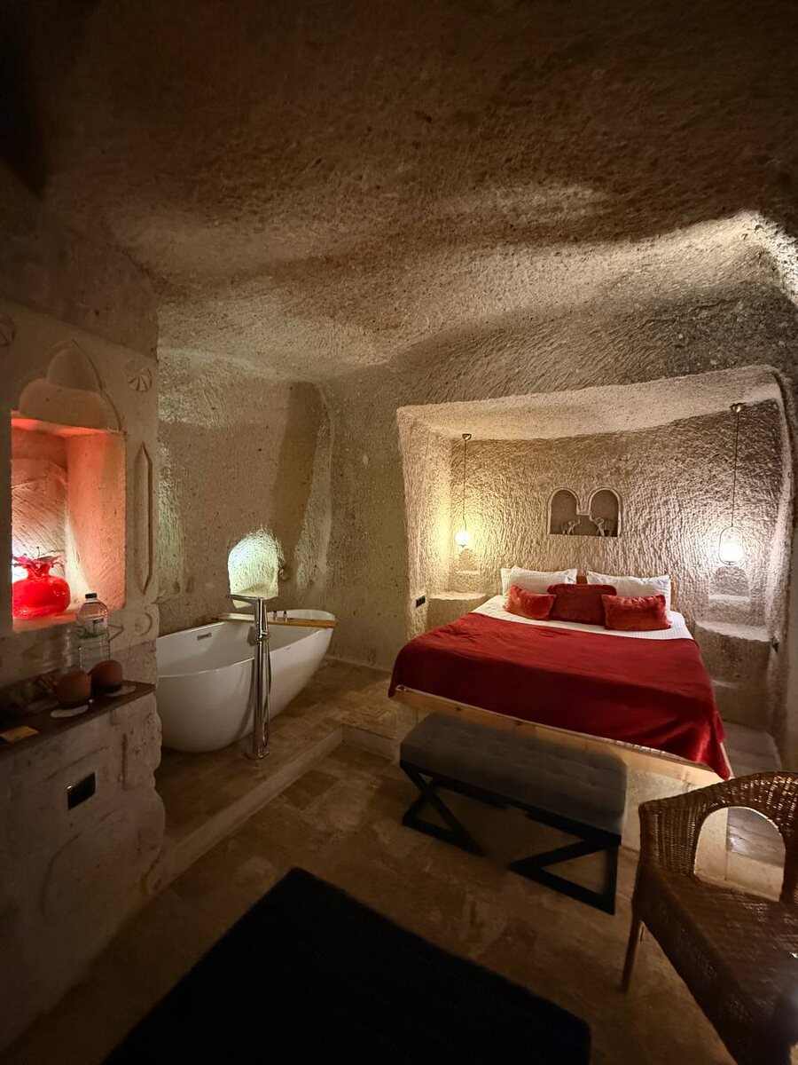 Вы когда-нибудь мечтали проснуться в сказке? Тогда представьте: вы открываете глаза, а вокруг — мягкие своды древней пещеры, освещённые тёплым светом. Вы не в обычном отеле — вы в сердце Каппадокии, в уникальном номере, высеченном в скале. Но это не мрачное подземелье, а роскошное убежище, где каждая деталь создана для вашего комфорта. Здесь прохладно в знойный день и тепло в прохладный вечер. Стены, хранящие многовековые истории, теперь оберегают и ваш покой. Мягкая кровать с шелковистым бельём, стильный интерьер с этническими акцентами, современная ванная комната — в этой пещере есть всё, чтобы чувствовать себя уютно. А утро… О, утро здесь — это нечто волшебное! Вы выходите на террасу с чашкой ароматного турецкого чая, и перед вами разворачивается потрясающее зрелище: сотни разноцветных воздушных шаров медленно поднимаются в небо, окрашивая рассвет в пастельные тона. Воздух наполнен тишиной и лёгким шепотом ветра — вы замираете, понимая, что таких моментов в жизни немного.