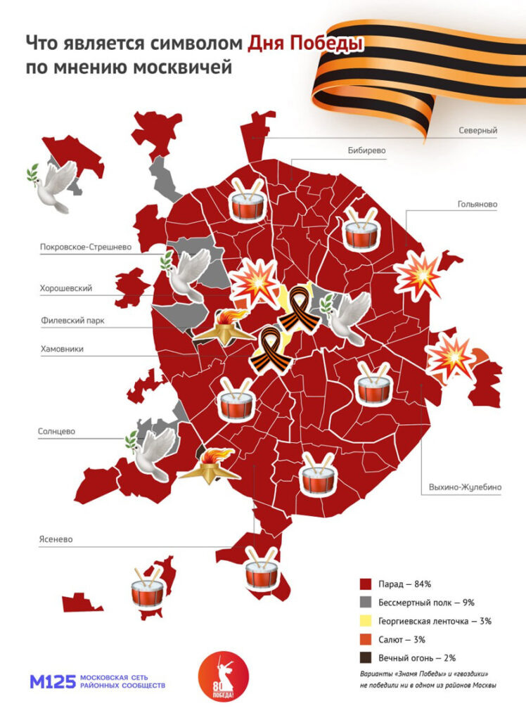 - Еще 3% считают главным символом праздника георгиевскую ленточку. Такой вариант выбрали преимущественно жители районов Мещанский, Хамовники и Тверской.