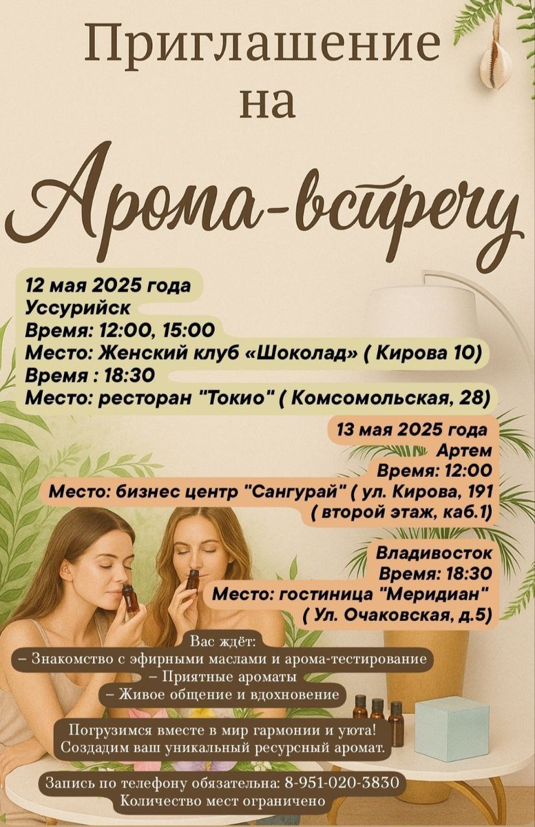 Дорогие девушки , хочу пригласить вас на бесплатную встречу с арома консультантом из Москвы. Только два дня будет в Приморском крае. 12 мая г.Уссурийск 12:00, 15:00 - женский клуб Шоколад (Кирова 10) 18:30 - ресторан Токио 13 мая Артем 12:00 - Бизнес центр Сангурай второй этаж каб. 1 (Кирова 191) Владивосток 18:30 - Гостиница Меридиан Вас ждёт: – Знакомство с эфирными маслами и арома-тестирование – Приятные ароматы – Живое общение и вдохновение Погрузимся вместе в мир гармонии и уюта! Создадим ваш уникальный ресурсный аромат. Запись по телефону обязательна: https://wa.me/79510203830 (Количество мест ограниченно)