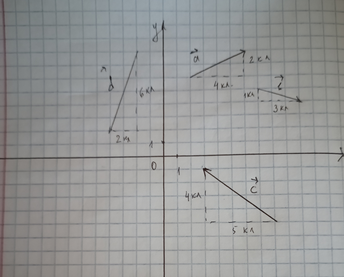Сколько клеток по высоте — это координата y Приведу пример: Исходя из приведенного примера можно записать координаты каждого вектора: а(4;2), в(3;1), с(5;4), d(2;6). Но это еще не полноценные координаты, т.к мы не поставили правильно знаки. Для этого нужно посмотреть на наклон стрелочки: у вектора а стрелочка смотрит вверх и вправо, значит, обе координаты будут со знаком "+", что абсолютно логично. у вектора в - вправо, но вниз, следовательно, по иксу з