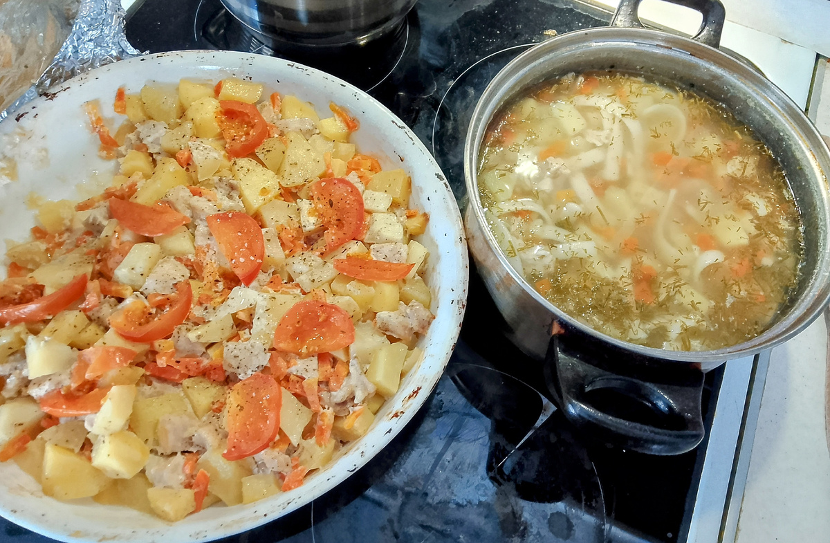 Среда 7 мая Последний рабочий день и снова длинные выходные. Иногда я думаю зачем я считаю рабочие дни, всё ровно сижу дома, занимаюсь детьми и домашними делами, но выходные для меня это хоть небольшой отдых как правило, никуда спешить, ехать не надо, тренировки, учебы, всё на паузе С утра была довольно солнечная погода, думала я как и планировала быстро приготовлю, положу Арсюшку на первый сон в коляску а сама поработаю во дворе, но увы так не получилось, обещанных +20 и солнце, после десяти утра мы не увидели, весь день крапал дождик, на улице было сыро и неприятно. На завтрак сварила детям манную кашу, пока старшего нет, а то он не любит Накормила Арсения и Анюту и взялась за готовку обеда, ужина На обед сделала супчик с индейкой и домашней лапшой, на ужин запекла картофель с морковью, индейкой и немного помидор было. Надо было мне творог переработать, иначе испортился бы Решила сделать сырники в духовке, делала с помощницей, главное сказать что мы делаем оладушки, иначе сырники