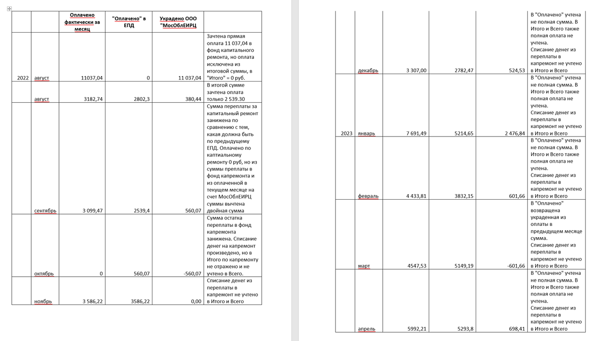 При сверке оплаченных нами и поступивших на расчетный счет ООО «МосОблЕИРЦ» сумм выявлено расхождение с данными, указанными в Едином платежном документе, сформированном ООО «МосОблЕИРЦ» в графе «оплачено» и учтенной в расчетах при начислении платежей, расчете «долга» и начислении пени. ООО «МосОблЕИРЦ» периодически занижает сумму оплаченную и поступившую на расчетный счет от плательщиков коммунальных платежей и взносов в фонд капитального ремонта. Также в нарушение плавил бухгалтерского учета часто суммы, списываемые из оплаченных, не попадают в итоговую сумму, что также увеличивает начисленный «долг» (деньги были оплачены, деньги были списаны на оплату услуги, но при этом итоговая сумма не учитывает это списание денежных средств, они как бы «исчезают в никуда», а фактически присваиваются ООО «МосОблЕИРЦ). На украденные суммы ООО «МосОблЕИРЦ начисляет «долг» и пеню на этот «долг».