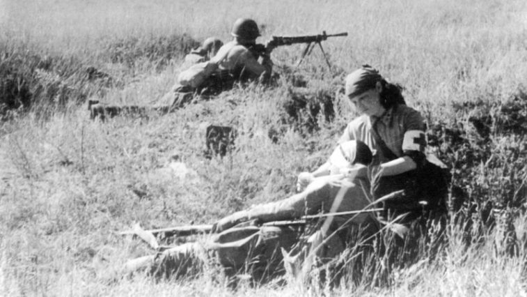 Заходное фото: Медсестра В. Смирнова на поле боя оказывает помощь раненому бойцу. 1942. Сталинград, район хутора Вертячий. Источник Rosphoto